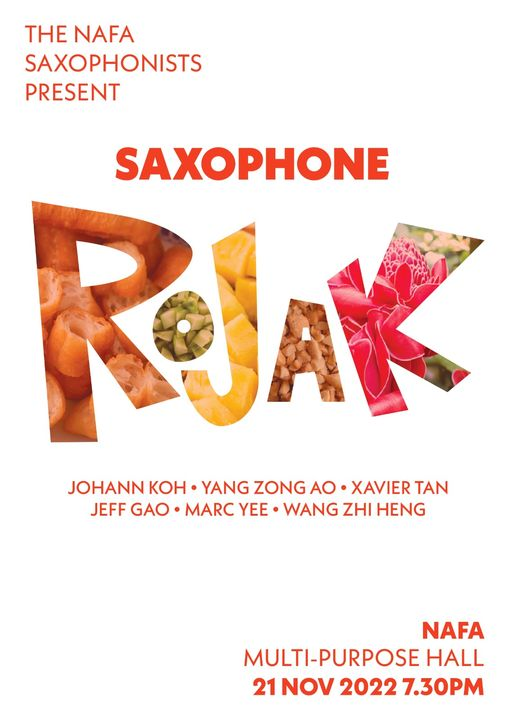 Uncategorized Saxophone Rojak Saxophone Rojak celebrates the hard work of my NAFA saxophone ensemble students over the past semester! 21 November 2022, 19h30NAFA Multi-purpose Hall Share this: Click to share on Facebook (Opens in new window) Facebook Click to share on X (Opens in new window) X Click to email a link to a friend (Opens in new window) Email Like Loading...